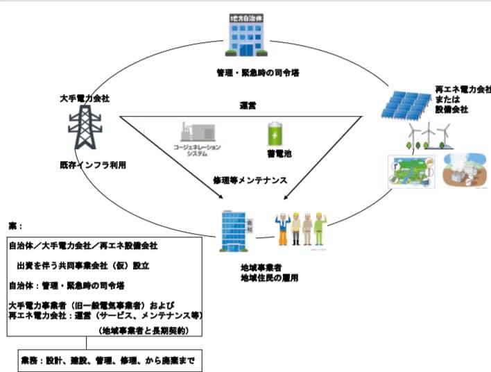イメージとしては、下図にあるように、地方自治体、大手電力会社、再エネ等業者が緊密に連携し(共同出資の会社をイメージ)、地域で生み出されたお金が地域内で周り、災害時には既存の送電網から隔離してリスクヘッジもできるようなシステム構築を目指します。