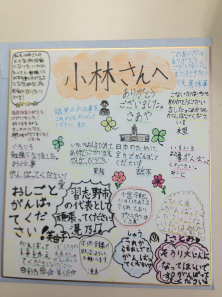 先日、国会にきてくれて一緒にミニ集会をした小学生2~6年生の皆さんから寄せ書きを頂きました。