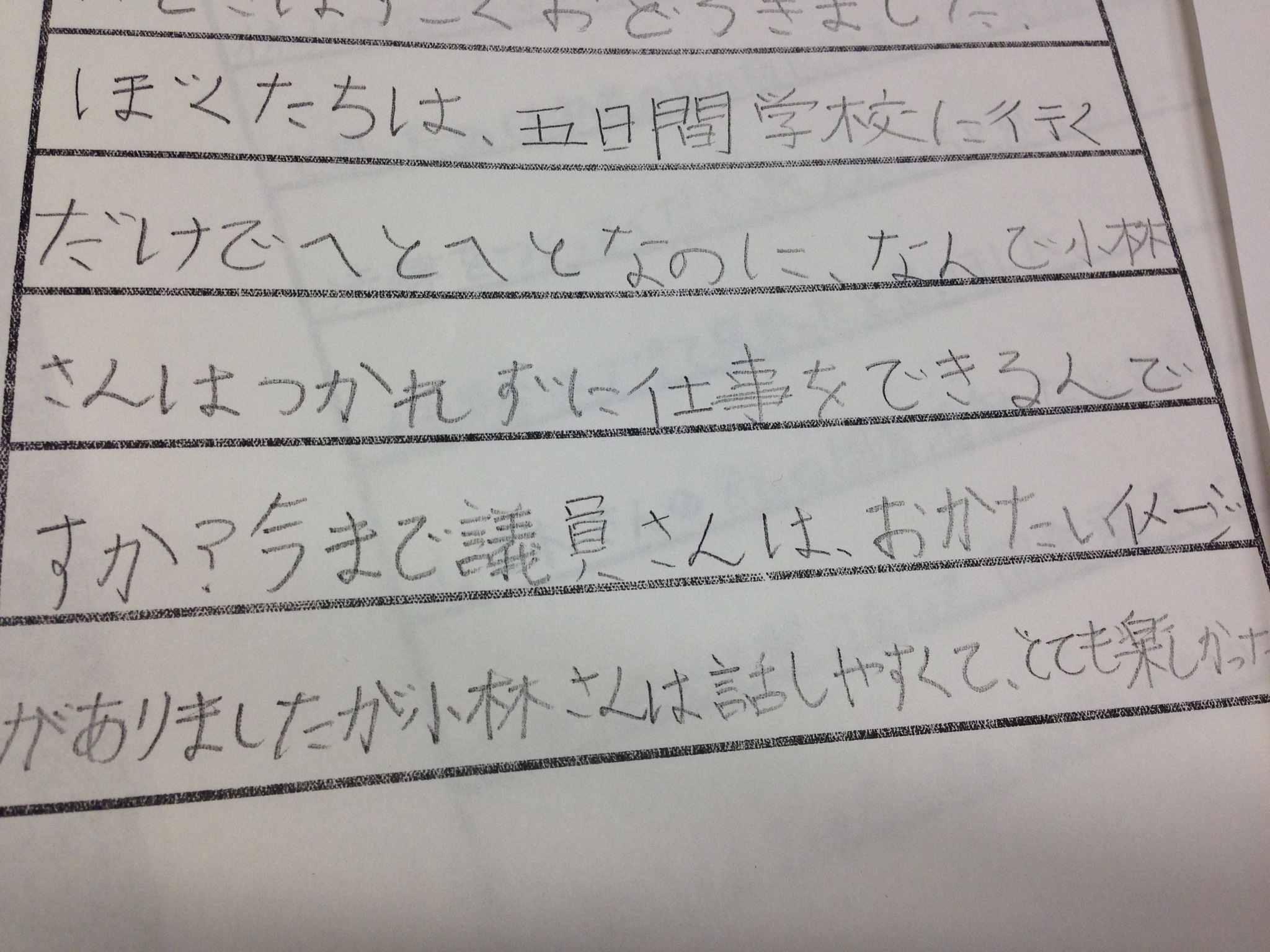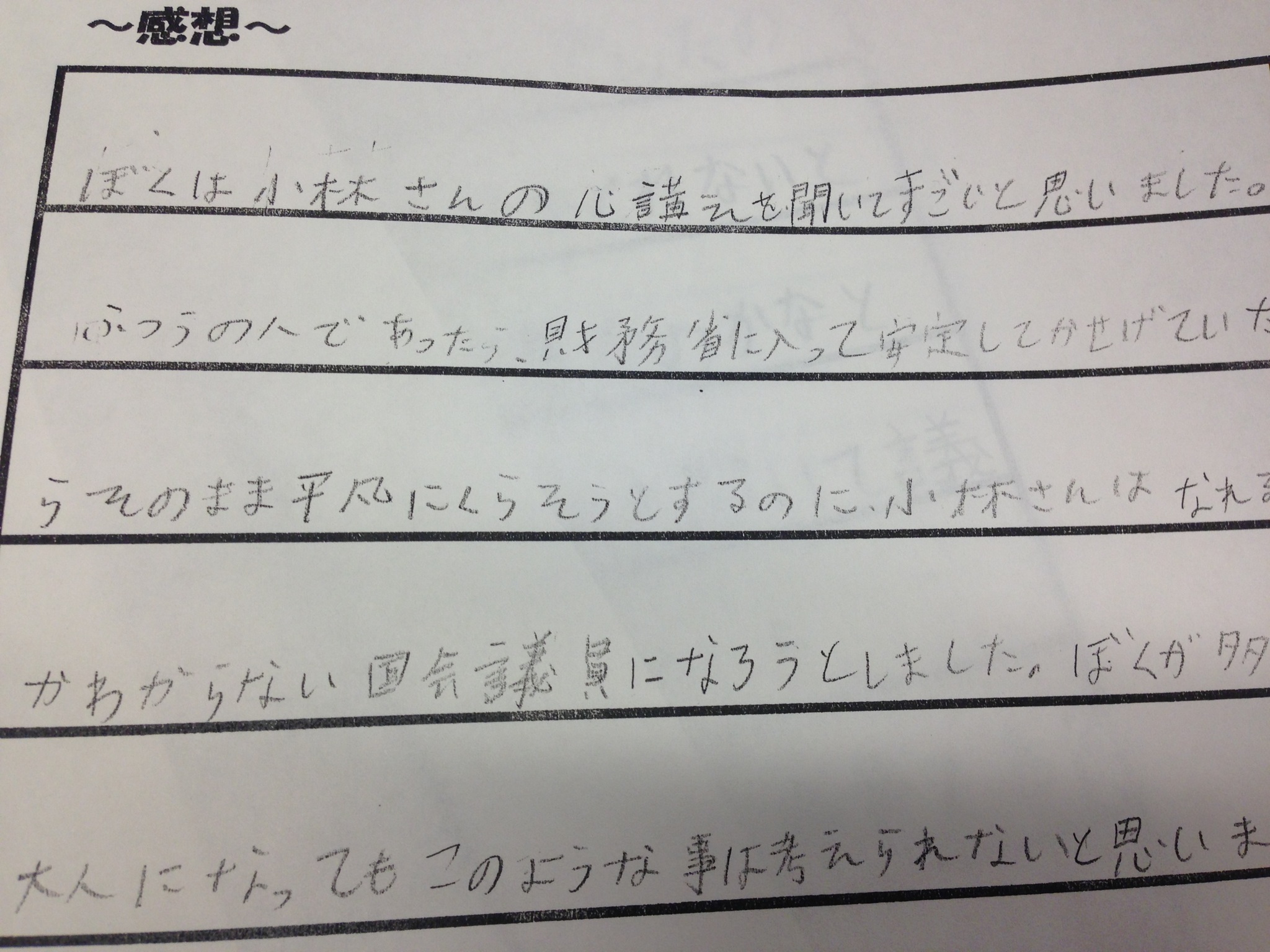 「ぼくは小林さんの心構えを聞いてすごいと思いました。ふつうの人であったら財務省に入って安定してかせげていたらそのまま平凡にくらそうとするのに小林さんはなれるかわからない国会議員になろうとしました。(中略)多分ぼくだったら安全に楽しくすごして、楽にすごすと思います。でも今日小林さんのお話を聞いて、安定だけを求めても楽しくなさそうだと思いました。これからは色々な事にチャレンジして、最高の仕事を見つけていきたいと思いました。