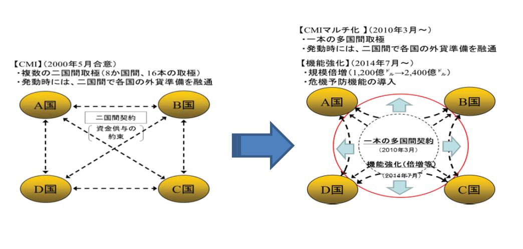 CMIMとは、1997年のアジア通貨危機の経験を踏まえ、金融危機時にアジア域内の各国間で基軸通貨である米ドルを融通し合う目的(いわゆる通貨スワップ)で、2000年に構築された仕組みのことです。