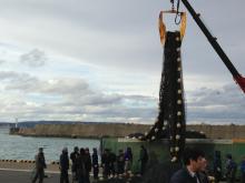 (久慈市小袖地区の漁港で定置網を替える漁師の方々。後ろに写っているのは、『あまちゃん』のオープニングで能年さんが走って飛び込む、あの場所です)